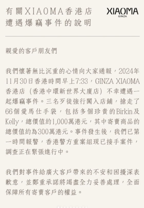 11月30日傍晚,位于香港中环的名牌手袋寄售店GINZA XIAOMA在唐突媒体发文称遭到贼东谈主盗窃。据悉,涉事店铺被窃走66个爱马仕手袋,总价约1000万港元。