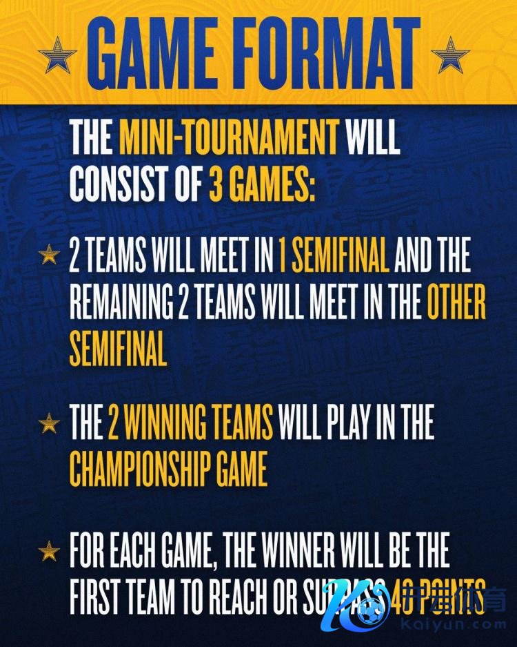 ⭐NBA全明星赛将初次以四支球队和三场比赛的袖珍锦标赛为特点,两支军队将在一场半决赛中再会(第一场),剩下的两支军队将在另一场半决赛中再会(第二场)。第一场和第二场见效的军队将在冠军赛中再会(第三场)。每场比赛中,第一个得分达到或朝上40分的军队将成为见效者。