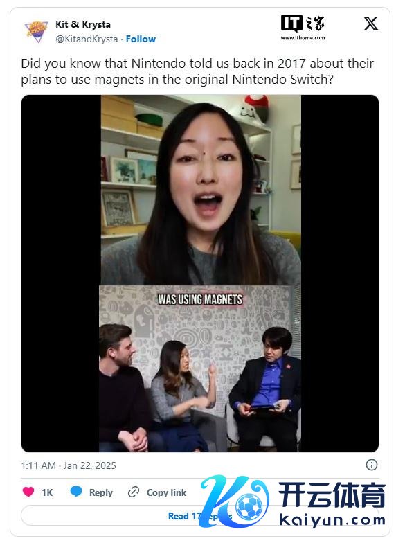 据 EuroGamer 报说念,任天国前职工 Krysta Yang 近日共享了一段视频,展示了 2017 年时任天国高管、被誉为" Switch 幕后推手"的 Yoshiaki Koizumi 与 Yang 及另一位前职工 Kit Ellis 盘考 Joy-Con 联想的场景。Yang 在视频中提到:" Switch 团队其时对使用磁吸形势固定 Joy-Con 相等感兴致,Koizumi 先生也对此充满关注。"