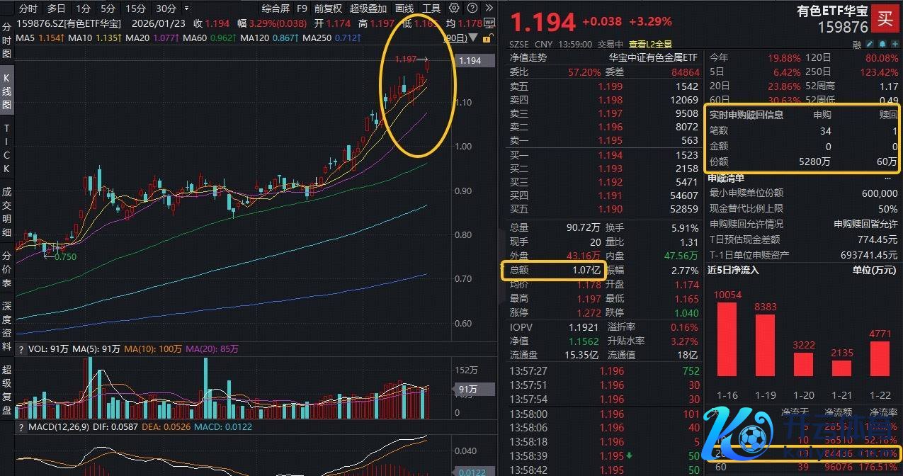 冲击日线5连阳!本日(1月23日)有色金属板块延续狠恶攻势九游体育app娱乐,板块热点ETF——有色ETF华宝(159876)场内涨幅盘中上探3.55%,现涨3.29%,续创历史新高!及时成交额1.07亿元,现时成交额已超昨天全天。