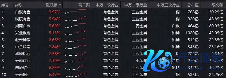 成份股方面,白银有色、铜陵有色涨停,湖南白银、兴业银锡涨逾9%,驰宏锌锗、中金岭南、华峰铝业等个股大幅跟涨。权重股方面,山东黄金涨超2%,洛阳钼业涨逾1%,紫金矿业、中国铝业、朔方稀土飘红。